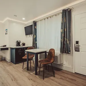 The rooms have private bathrooms with a walk-in shower and a separate toilet. The units also have a microwave oven, a coffee maker, and a fridge.